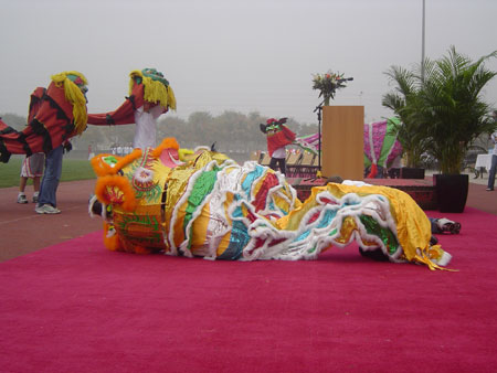 There was also a strong Chinese element to the festivities. A dragon and lion dance was about to start when some of the students in the field ran out of the crowd to pick up their dragon and lion costumes. But the dance was put off for a few minutes because one of the students holding the lion's head was not there.