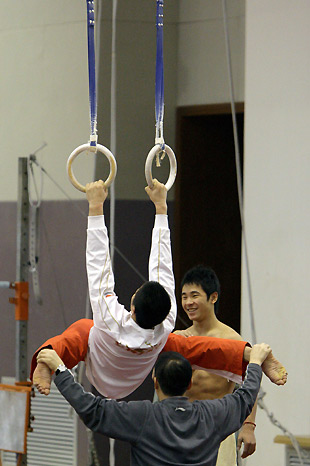 A gymnast stretches with an assistant coach as his team mate laughs during a training session at the General Administration of Sport in Beijing November 9, 2007. According to Chinese sports officials, there are around 1300 athletes currently in training throughout China, with a national team of around 570 expected to compete in next year's Olympic Games, the largest ever Chinese team. [Agencies]