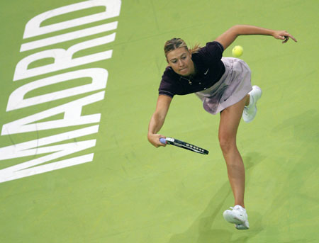 Maria Sharapova of Russia returns a forehand to Justine Henin of Belgium during their final match at the WTA Championships tennis tournament in Madrid November 11, 2007. [Agencies]