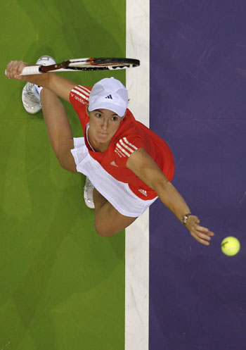 Justine Henin of Belgium serves to Maria Sharapova of Russia during their final match at the WTA Championships tennis tournament in Madrid November 11, 2007. [Agencies]