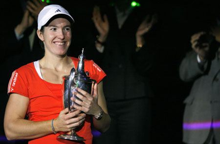 Justine Henin of Belgium smiles as she holds the trophy after winning the final match against Maria Sharapova of Russia at the WTA Championships tennis tournament in Madrid November 11, 2007. [Agencies]