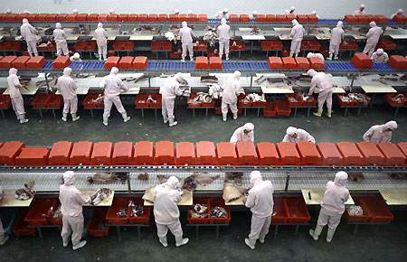 Workers cut pork at a production line in an abattoir on the outskirts of Beijing November 12, 2007. All supplies to athletes, trainers and coaches will be scrutinized in a tracking system, which monitors food production, processing and delivery as well as hygiene conditions. [Agencies]