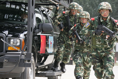 Members of an elite force of Chinese armed policemen called "Snow Leopard Commando" take part in an anti-terrorism drill in this August 25, 2007 file photo. Xinhua News Agency reports that this special taskforce, which is responsible for anti-terrorism, is training to ensure tight security for next year's Games. [Xinhua]