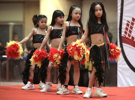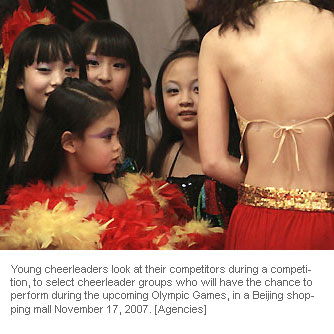 Young cheerleaders perform during a competition, to select cheerleader groups who will have the chance to perform during the upcoming Olympic Games, in a Beijing shopping mall November 17, 2007. The 2008 Beijing Games are expected to turn a profit of about $20 million to $30 million, according to a senior Games organiser. [Agencies]
