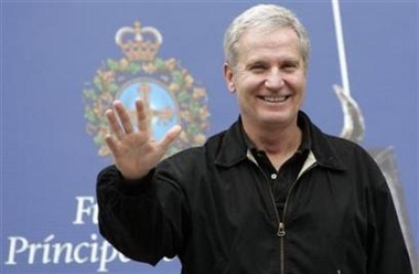 John Fahey waves to photographers after arriving in the Spanish northern town of Oviedo October 17, 2006. Fahey, poised to replace Dick Pound as president of the World Anti-Doping Agency (WADA), must quickly establish himself as a crusader in the role. [Agencies]