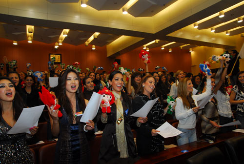 Miss World contestants rehearse for the recording of an English Olympic music video - "Light the Passion Share the Dream" - in Beijing Monday November 19, 2007. A total of 106 Misses are all contestants to the final of the 57th Miss World Competition in Sanya, South China's Hainan Province that will begin on December 1. [BOCOG]