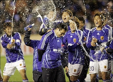 Japan's under 22 football players spray water to their coach Yasuharu Sorimachi as they celebrate after their Asia Olympic qualifying match against Saudi Arabia in Tokyo. Japan qualified for the 2008 Beijing Olympic games. Both teams finished the match in a draw 0-0. [Agencies] |