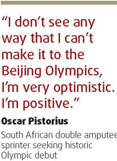 "I don't see any way that I can't make it to the Beijing Olympics," Pistorius, who turned 21 Thursday, told China Daily by phone. "I'm very optimistic. I'm positive."