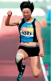 Wang Juan, a Chinese long jump athlete wearing a tailored prosthetic, wins a silver medal at the Athens Paralympics in 2004. Almost all of China's track and field team will wear prosthetics at the Beijing Paralympics next September. [Xinhua]
