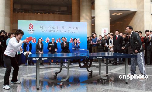 Foreign Minister Yang Jiechi plays against Chinese ping-pong queen Deng Yaping for a game at the foreign ministry's building in Beijing November 25, 2007. It was the ministry's second public open day this year, themed "Chinese diplomacy, Beijing Olympics". Around 120 visitors from around the world, including British Ambassador William Ehrman and Greek Ambassador Michael Cambanis, turned up for the event. [cnsphoto]