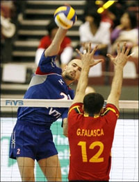 Russia's Semen Poltavskiy spikes the ball over the block of Spain's Guillermo Falasca during their third round match at the men's World Cup volleyball tournament in Fukuoka. [Agencies] |