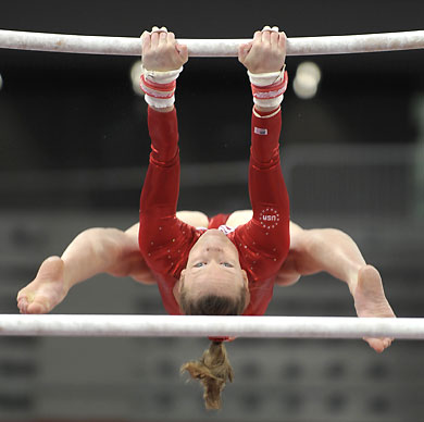 Bridget Sloan of the US performs her routine on the uneven bars during the Artistic Gymnastics Women's Individual all-round final at the International Invitational tournament held at the National Indoor Stadium in Beijing November 29, 2007. Jiang Yuyuan of China scored 61.225 points to lead all four apparatuses in the women's all-around, followed by runner-up Daria Joura from Australia and bronze medalist Bridget Sloan of America. [Xinhua]