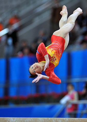 China's Cheng Fei competes in women's balance beam during the 2007 Good Luck Beijing Olympic test games at the National Indoor Stadium in Beijing on December 3, 2007. Cheng won the title. [Xinhua]