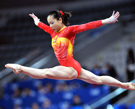 China's Cheng Fei, a triple gold medalist in vault, competes to win the Artistic Gymnastics women's balanced beam final at the International Invitational tournament held at the National Indoor Stadium in Beijing December 3, 2007. [Xinhua]