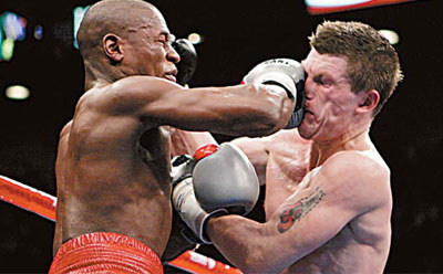 Floyd Mayweather (left) punches England's Ricky Hatton during their WBC welterweight boxing title fight at the MGM Grand hotel and casino in Las Vegas on Saturday. Mayweather won by 10th-round knockout. [Agencies]