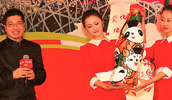 Chen Nan (L), one of the main designers of Fuwa, the Olympic mascots for 2008, has drawn the five mythical creatures on a large plastic bottle of Coca-Cola and submitted it to the soft drink giant's lastest campaign, entitled: 'Open up my home town to the world'. [China Daily]