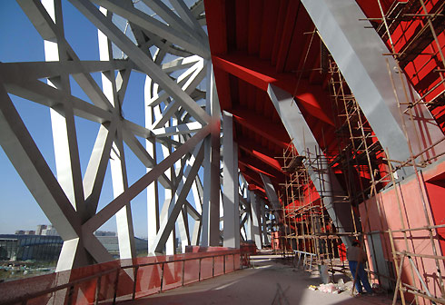 A man works at the construction site of the National Stadium, the main venue of the 2008 Olympic Games. Organizers of the Beijing Games said yesterday that 26 of the total 31 venues have been completed. The photo was taken on October 31, 2007 [Xinhua]