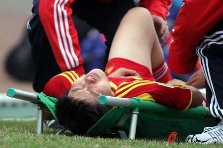 China's Ma Xiaoxu, winner of Asian Player of the Year groans as team staffs carry her off the field after she injured her left knee during a warm-up match against New Zealand in Guangzhou of South China December 19, 2007. China won 4-0 (one New Zealand's own goal). Ma's bad injury casts doubt over her appearance in next year's Olympics. [Xinhua]