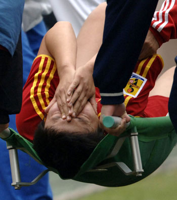 China's Ma Xiaoxu, winner of Asian Player of the Year groans as team staffs carry her off the field after she injured her left knee during a warm-up match against New Zealand in Guangzhou of South China December 19, 2007. China won 4-0 (one New Zealand's own goal). Ma's bad injury casts doubt over her appearance in next year's Olympics. [Xinhua]