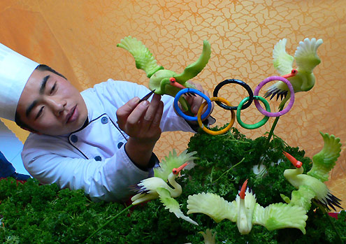 Wang Lianhou, a sculptor in Northeast Heilongjiang Province, presents his Olympic-themed work on December 7, 2007. All elements of this work are vegetables including carrots, Chinese melons and pumpkins. [newsphoto]
