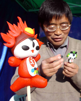 Folk artist Lu Shuhua works on a flour miniature in the shape of the mascots of the 2008 Olympic Games.  [newsphoto]