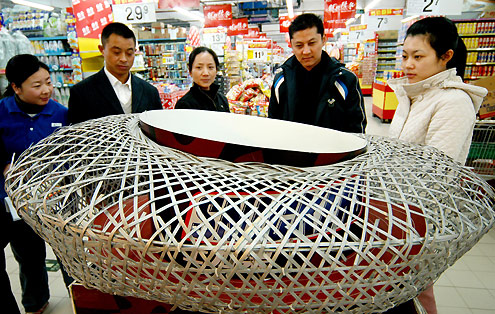 Consumers look at a National Stadium model woven by bamboo strips at a super market in East China's Jiangsu  Provence on November 29, 2007. The National Stadium is the main venue for the openning ceremony of the 2008 Olympics. [newsphoto]