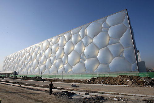 A worker walks next to the National Aquatics Center on January 3, 2008. The stadium, also known as Water Cube, will host a venue trial event late this month. [Xinhua]