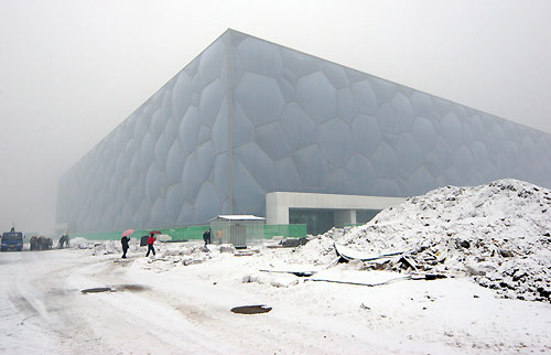 The National Aquatics Center in snow in December 2007. [asianewsphoto]
