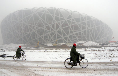 The National Stadium in snow in December 2007. [asianewsphoto]