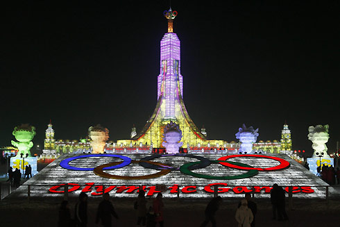A general view shows an ice sculpture of the Olympic Tower at the Ice and Snow World in Harbin, Heilongjiang Province, January 5, 2008. [Agencies]