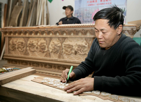 Artist Kang Yinzhong (R) carves a wooden screen at a workshop in Sanquan village in Yuanping, North China's Shanxi Province, January 10, 2008. Eight craftsmen in the village are working on a giant wooden screen featuring 2,008 dragons as a gift for this year's Beijing Olympic Games. [Xinhua]