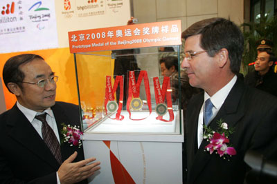 Zhao Dongming (L), director of BOCOG's cultural activities department, and Clinton Dines, BHP Billiton China president, talk in front of an Olympic medal display Tuesday in Shanghai. [China Daily]