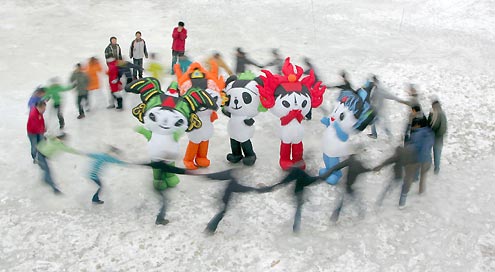 Local residents dance at an outdoor rink at Balikun County, Northwest China's Xinjiang Uygur Autonomous Regin, on January 15, 2008. [Xinhua]