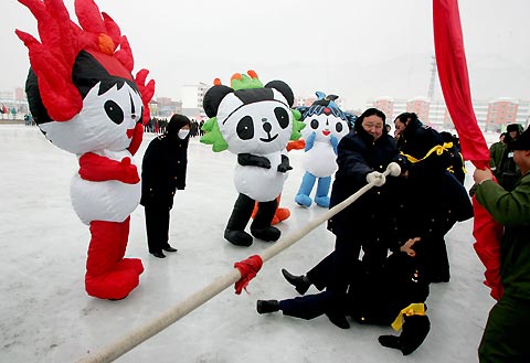 Local residents play tug of war at an outdoor rink at Balikun County, Northwest China's Xinjiang Uygur Autonomous Regin, on January 15, 2008. [Xinhua]