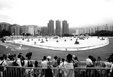 Reporters and photographers scope out the Shatin Venue for jumping and dressage equestrian events at the Good Luck Beijing Hong Kong 10th Anniversary Cup last August. Humid weather led to the pullout of the Swiss dressage team and two Canadian riders out of concern for the horses' health. Inset: Swiss top dressage rider and world No 4 Silvia Ikl waves to the crowd. [Agencies]