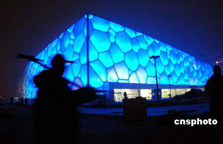A worker walks past the National Aquatics Center, also known as the Water Cube, in Beijing on January 18, 2008. The venue built for the Olympic swimming and diving events is said to be completed on Jan. 28, 2008. [cnsphoto]