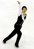 Wu Jialiang performs to clinch the title in free skating men's singles at the 11th National Winter Games in Qiqihaer, Northeast China's Heilongjiang Province, Jan. 20, 2008. [Xinhua] |