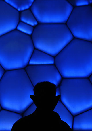 A resident looks at the exterior of the National Aquatics Centre, also known as the Water Cube,which is lit by blue lights at night in Beijing January 19, 2008. The centre, built for the Beijing Olympics, will host its first event - the "Good Luck Beijing" Swimming China Open - from January 31 to February 5. [Agencies]