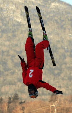 Li Ke competes during the individual men's freestyle aerials final at the 11th Chinese National Winter Games in Yabuli, North China's Heilongjiang Province, Jan. 21, 2008. [Xinhua]