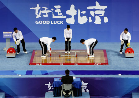 Technical workers prepare the stage before competition in the 2008 Good Luck Beijing International Weightlifting Invitational tournament at the Beijing University of Aeronautics & Astronautics Gymnasium in Beijing January 22, 2008. The gymnasium will be the venue of the weightlifting competition of the Beijing Olympic Games, which will open on August 8. [Agencies]