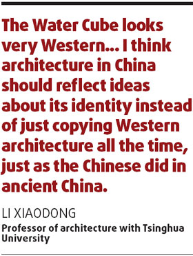 "The Water Cube looks very Western," says Tsinghua University's professor of architecture Li Xiaodong. "I think architecture in China should reflect ideas about its identity instead of just copying Western architecture all the time, just as the Chinese did in ancient China."