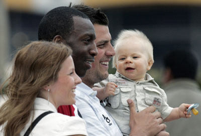 U.S. multiple Olympic gold medallist Michael Johnson (2nd L) poses for a picture with a family whilst participating in the PRO-Am of the Qatar Masters Golf Tournament in Doha, January 23, 2008. [Agencies]