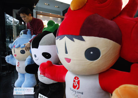 A staff member of a memorabilia shop arranges Beijing 2008 Olympic Games mascot dolls in Taipei January 23, 2008. [Agencies]
