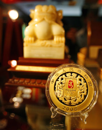 A Beijing 2008 Olympic Games gold coin worth 468,000 TWD ($14,442) is displayed inside a memorabilia shop in Taipei January 23, 2008. [Agencies]