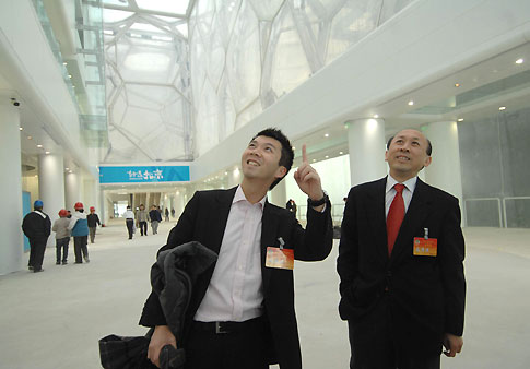 Visitors look up at the National Aquatics Centre, also known as the Water Cube in Beijing January 23, 2008. The centre, built for the Beijing Olympics, will host its first event - the "Good Luck Beijing" Swimming China Open - from January 31 to February 5. [Xinhua]