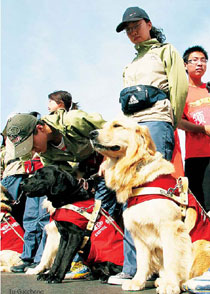 Guide dogs attend the opening ceremony of the Dalian International Marathon Tournament in June. [China Daily] |