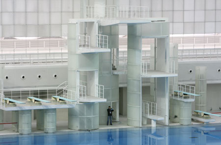 A worker takes photographs under the Olympic diving platforms during the inauguration ceremony of the National Aquatics Centre in Beijing January 28, 2008. China officially unveiled its bubble-wrapped National Aquatics Centre, nicknamed the "Water Cube", on Monday, one of the two iconic venues for this year's Beijing Olympics. The imposing rectangular box, clad in a honeycomb of transparent cushions, will host the swimming, diving and synchronised swimming during the Aug. 8-24 sporting spectacular. [Agencies]
