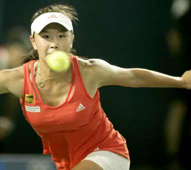 Chinese tennis player Peng Shuai returns a ball in her match against third-seeded Frenchwoman Amelie Mauresmo at the Beijing Tennis Center in this September 21, 2007 file photo. Peng beat Mauresmo 4-6, 6-4, 6-2 to grab the last berth of the last four at the China Open WTA tournament. [Xinhua] |