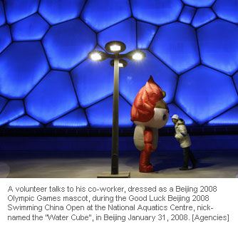 A volunteer dressed as a Beijing 2008 Olympic Games mascot stands outside the National Aquatics Centre, nicknamed the "Water Cube", during the Good Luck Beijing 2008 Swimming China Open in Beijing January 31, 2008. The Olympic venue for swimming, diving and synchronised swimming at the Beijing Games opened with a test event on Thursday allowing the Chinese capital's residents to ponder the ethereal cuboid structure at close range for the first time. [Agencies]