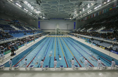 Officials watch as swimmers compete in the Good Luck Beijing 2008 Swimming China Open at the National Aquatics Centre in Beijing January 31, 2008. The Olympic venue for swimming, diving and synchronised swimming at the Beijing Games opened with a test event on Thursday allowing the Chinese capital's residents to ponder the ethereal cuboid structure at close range for the first time. [Agencies]